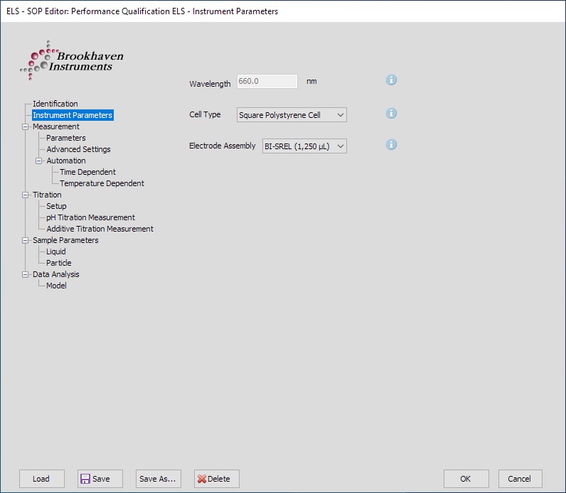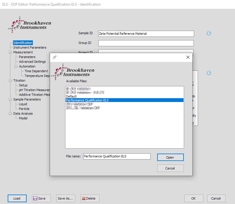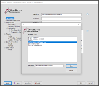 Particle Solutions 軟件預裝了用于性能驗證的標準操作程序(SOP)。打開 Particle Solutions 軟件,選擇 ELS 或 PALS 測量。在打開的的測量窗口中,點擊 “SOP”,然后點擊“加載”,分別選擇“ELS 性能驗證”或“PALS 性能驗證”,點擊“打開”。