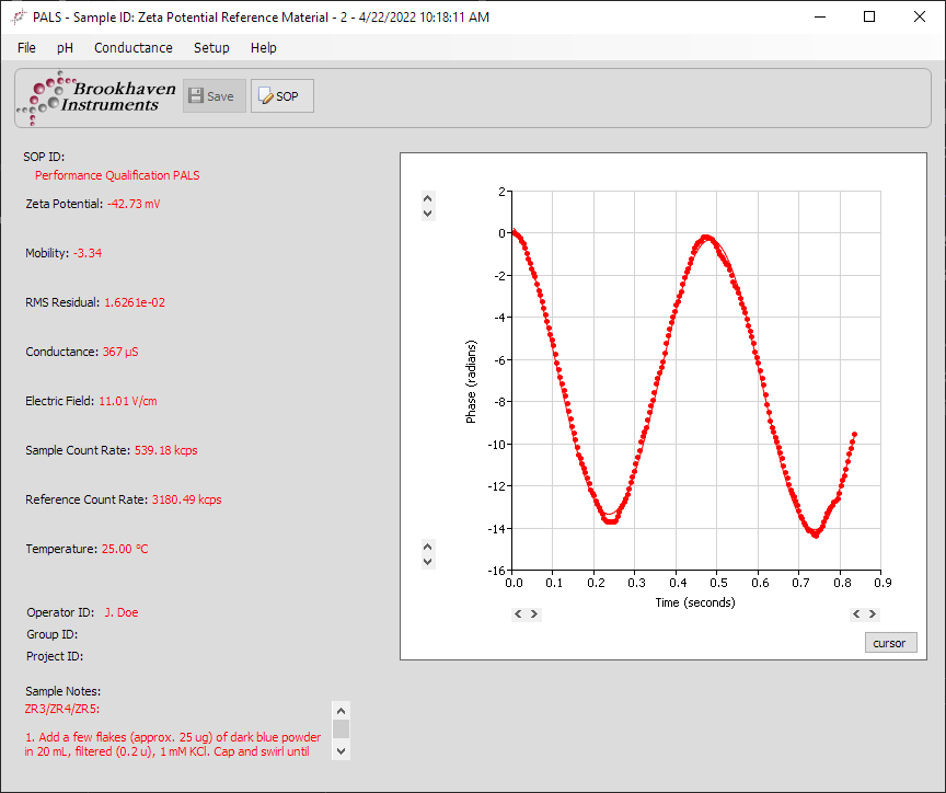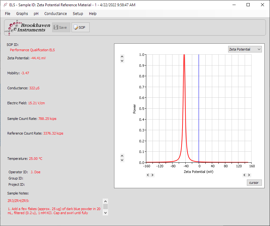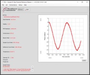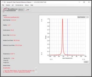 在下拉菜單中選擇正確的樣品池種類和電極組件類型,所有其他參數保持默認設置。將 Zeta 電位電極插入裝有 BI-ZR5 參考溶液的樣品池中,然后將其放入 NanoBrook 儀器。使用性能驗證SOP開始測量,并根據默認穩定時間等待樣品穩定,這將使樣品能夠達到 SOP 中所設定的測量溫度。